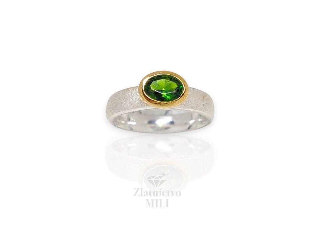 Materiál: pozlátené striebro – 5 mikrónov Rýdzosť striebra: Ag 925/1000 Drahokamy: chrómdiopsit Rozmer drahokamu: cca 5 mm Hmotnosť: 3,61g Tvar: kruh Veľkosť: 55...